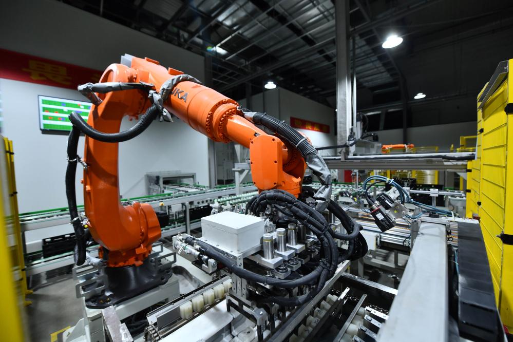 在廣西柳州市一家新能源汽車電池生產(chǎn)企業(yè),機器人在生產(chǎn)線上作業(yè)(2023年5月10日攝)。新華社記者黃孝邦攝