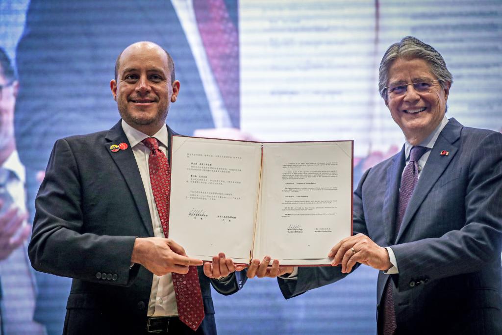 2023年5月10日,厄瓜多爾總統(tǒng)拉索(右)與厄瓜多爾生產(chǎn)、外貿(mào)、投資和漁業(yè)部部長普拉多在厄瓜多爾基多展示中厄自貿(mào)協(xié)定文件。新華社發(fā)(厄瓜多爾總統(tǒng)府供圖)