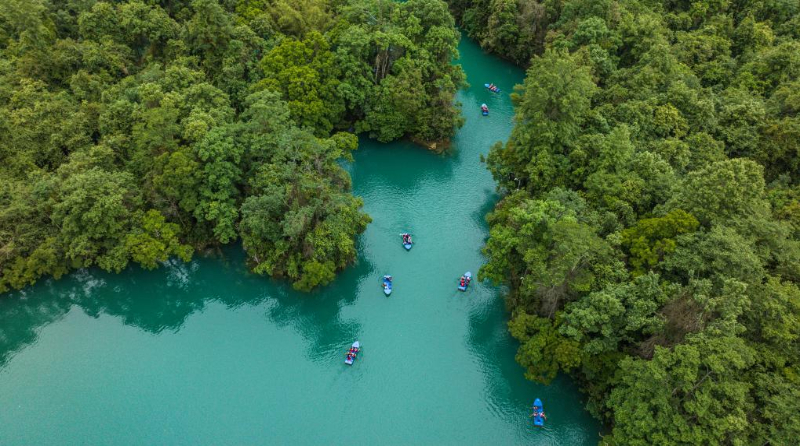 游客在荔波縣小七孔景區(qū)劃船游玩(5月16日攝,無人機照片)。新華社記者 陶亮 攝