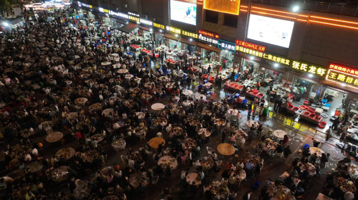 在江蘇盱眙的大桐農貿市場,聚集著數十家以經營小龍蝦為主的餐飲店、大排檔。暮色降臨,數千平方米的露天廣場上,游客座無虛席,空氣中彌漫著撲鼻香氣。