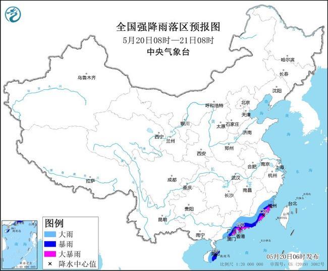 預(yù)計(jì),5月20日08時(shí)至21日08時(shí),廣東中東部、福建東部、海南島中東部等地部分地區(qū)有大到暴雨,其中,廣東南部沿海、福建東南部等地部分地區(qū)有大暴雨(100~150毫米)。上述部分地區(qū)伴有短時(shí)強(qiáng)降水(最大小時(shí)降雨量20~50毫米,局地可超過(guò)60毫米),局地有雷暴大風(fēng)等強(qiáng)對(duì)流天氣。