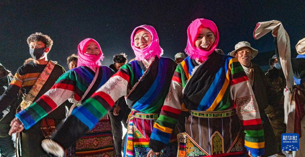 當(dāng)?shù)厝罕娫诩{木錯開湖篝火晚會現(xiàn)場跳鍋莊(5月18日攝)。