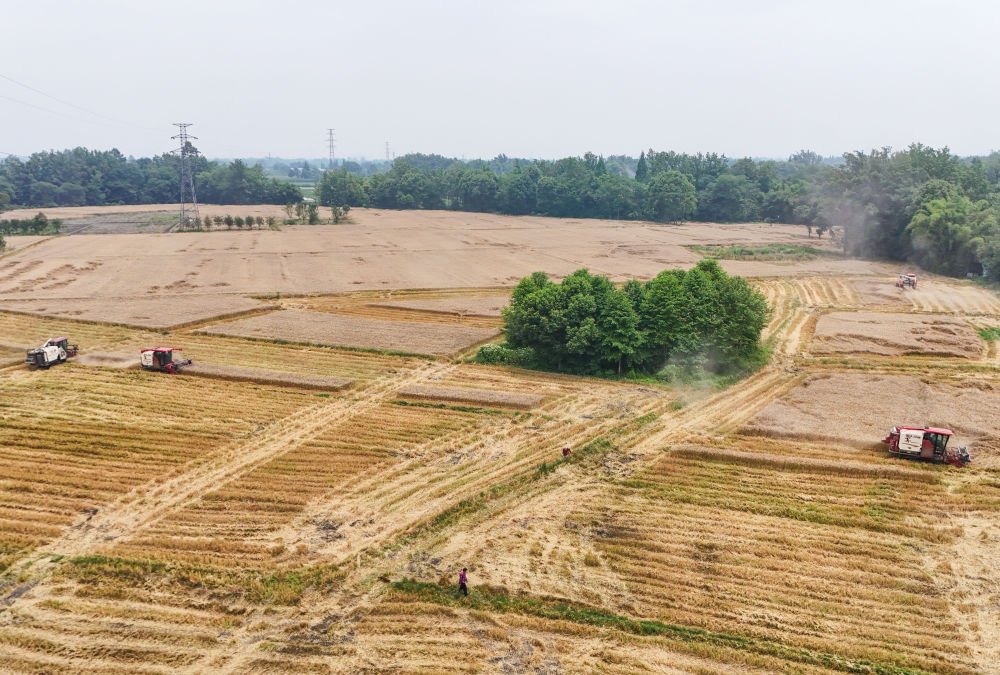 在四川成都崇州市三江街道古泉村,收割機在麥田里收割小麥(5月15日攝)。