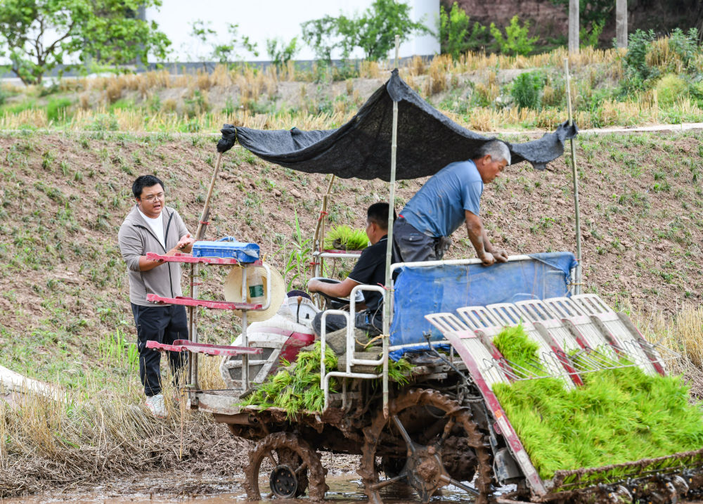 在四川成都東部新區(qū)董家埂鎮(zhèn)小河村,舒星宇(左)在和插秧機手溝通機插秧的注意事項(5月15日攝)。