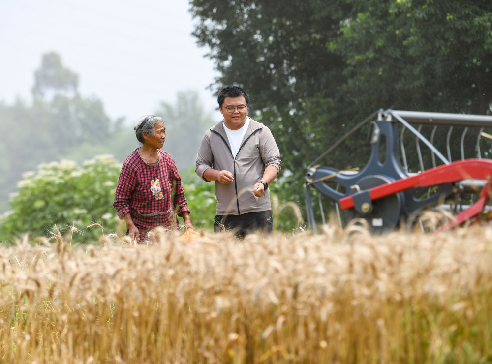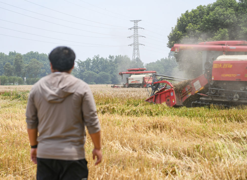 在四川成都崇州市三江街道古泉村,舒星宇在麥田邊觀看小麥?zhǔn)崭顧C作業(yè)(5月15日攝)。