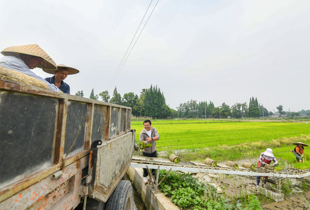 在四川成都崇州市大劃街道石橋村,舒星宇(左三)在幫忙運送秧盤(5月15日攝)。