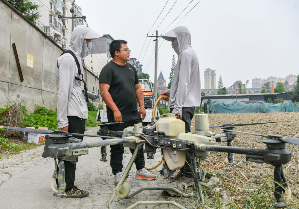 在四川成都溫江區(qū)萬春鎮(zhèn),舒星宇(中)和植保無人機飛手在溝通當(dāng)天打藥的區(qū)域和作業(yè)時間(5月16日攝)。