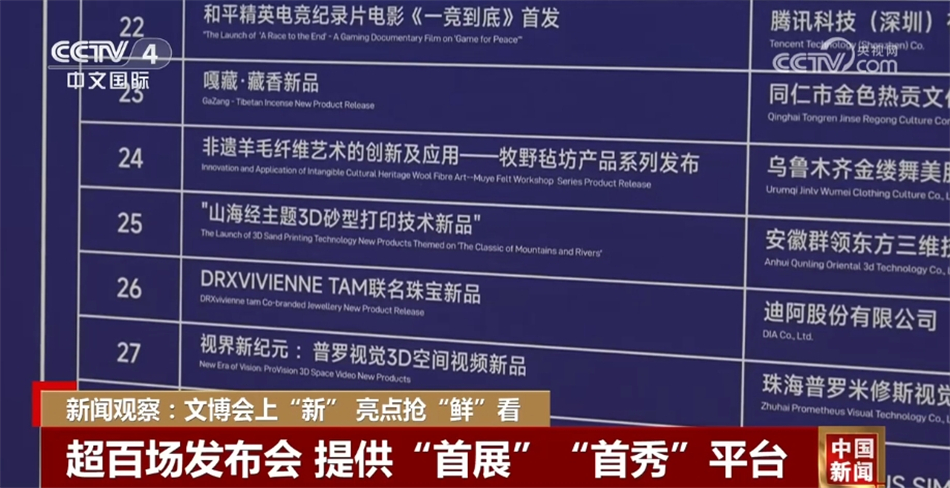 首次設(shè)立國(guó)際文化貿(mào)易展,邀請(qǐng)西班牙貿(mào)易協(xié)會(huì)、尼泊爾工商聯(lián)合會(huì)等國(guó)外貿(mào)易機(jī)構(gòu)參展,一站式包攬各地文化產(chǎn)業(yè)精品;在影視·出版·版權(quán)·游戲電競(jìng)展,首次亮相的“城市文化合伙人”主題展呈現(xiàn)“文化+交易產(chǎn)業(yè)融合新產(chǎn)品”,傳播城市優(yōu)秀文化。據(jù)悉,今年的文博會(huì)將舉辦超100場(chǎng)創(chuàng)新項(xiàng)目及新品發(fā)布會(huì)和超20場(chǎng)招商會(huì)、推介會(huì)等,為國(guó)內(nèi)外新產(chǎn)品、新技術(shù)、新業(yè)態(tài)、新服務(wù)的發(fā)布提供“首展”“首發(fā)”“首秀”平臺(tái)。