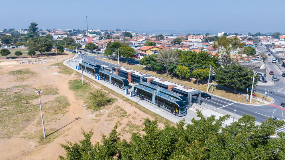 這是2023年7月12日在巴西圣保羅州圣若澤杜斯坎普斯快速公交系統(tǒng)“綠線”始發(fā)站拍攝的比亞迪純電動(dòng)大巴(無(wú)人機(jī)照片)。新華社記者王天聰攝