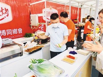 香港淄博同鄉(xiāng)會(huì)會(huì)長耿國華在淄博燒烤攤位制作特色美食。