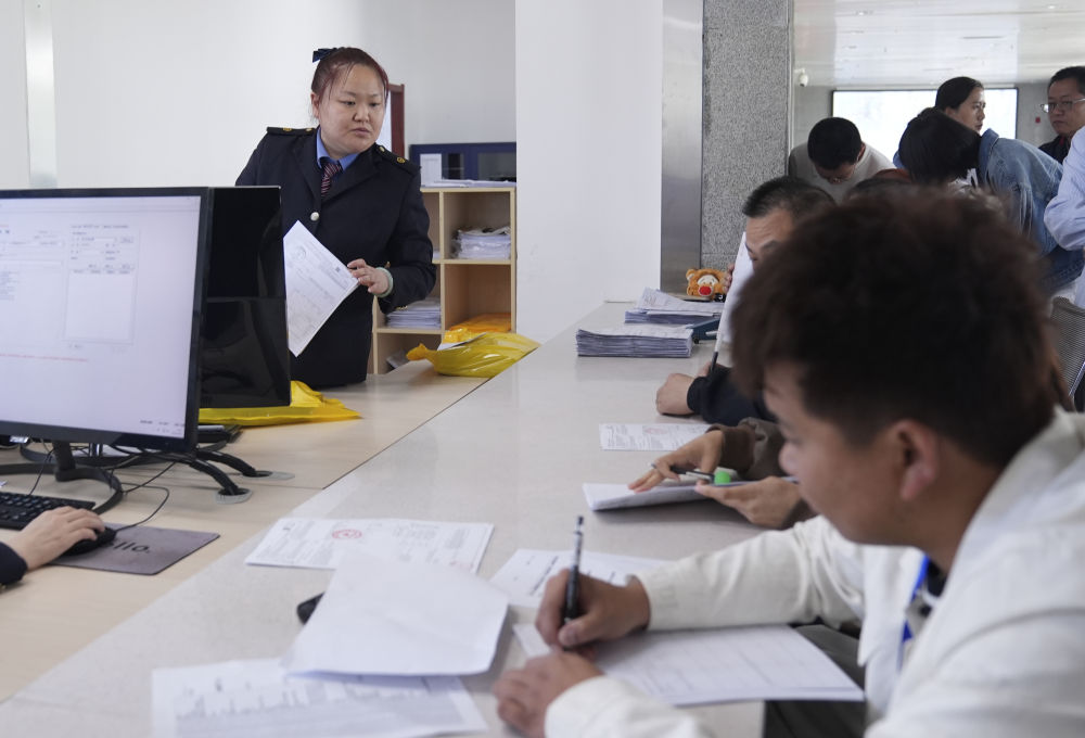 在霍爾果斯鐵路口岸站聯(lián)運(yùn)大廳內(nèi),出口貨運(yùn)員在為客戶辦理更正國(guó)際聯(lián)運(yùn)運(yùn)單業(yè)務(wù)(5月29日攝)。
