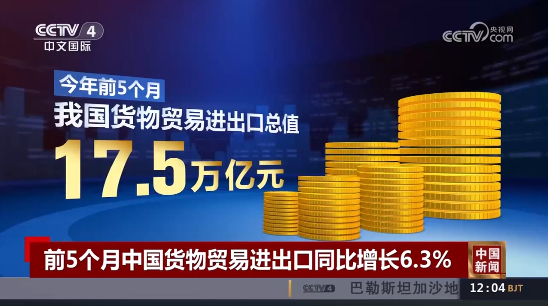 據(jù)海關(guān)統(tǒng)計(jì),今年前5個(gè)月,我國(guó)貨物貿(mào)易進(jìn)出口總值17.5萬(wàn)億元,同比增長(zhǎng)6.3%。其中,出口9.95萬(wàn)億元,增長(zhǎng)6.1%;進(jìn)口7.55萬(wàn)億元,增長(zhǎng)6.4%。5月當(dāng)月,進(jìn)出口3.71萬(wàn)億元,同比增長(zhǎng)8.6%。其中,出口2.15萬(wàn)億元,增長(zhǎng)11.2%;進(jìn)口1.56萬(wàn)億元,增長(zhǎng)5.2%。