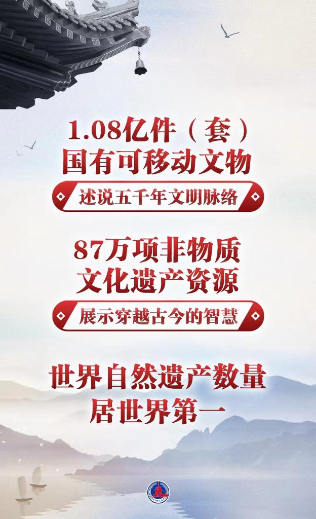 1.08億件(套)國有可移動文物述說五千年文明脈絡,87萬項非物質文化遺產(chǎn)資源展示穿越古今的智慧,世界自然遺產(chǎn)數(shù)量居世界第一……文化和自然遺產(chǎn)濃縮著中華文明發(fā)展和自然演進的珍貴成果。