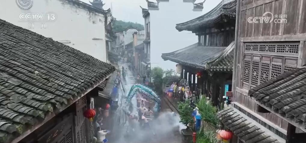 重慶市銅梁區(qū)的安居古城正在進(jìn)行端午節(jié)的非遺文化表演——水云龍。10名赤膊的漢子舞動(dòng)著一條18米的藍(lán)色水云龍,整條龍上下翻騰、左右騰挪,在兩邊明清時(shí)期的老屋之間穿行。而站在兩旁的居民和游客會(huì)拿著水瓢或者水盆,將清水潑向正在舞動(dòng)的水云龍。雖然水云龍所到之處,大家衣衫都可能打濕,但是大家都樂在其中。