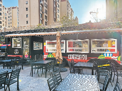 在霍爾果斯街頭,裝飾著中歐班列字樣的餐吧。