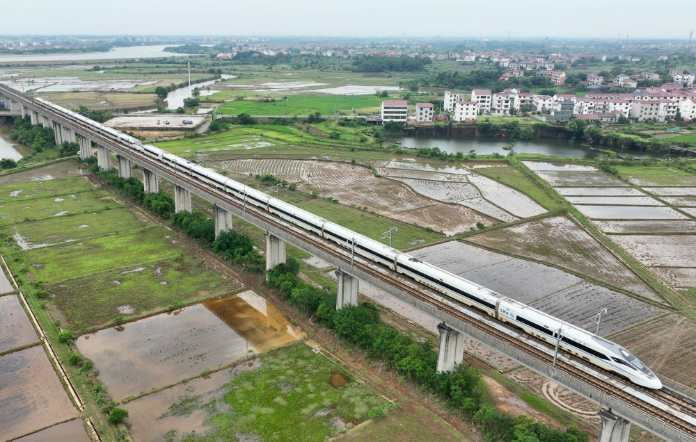 一輛高鐵列車從位于江西省鷹潭市的田野間駛過(無(wú)人機(jī)照片,6月4日攝)。新華社記者 萬(wàn)象 攝
