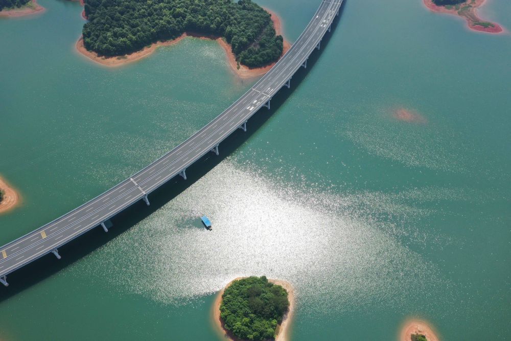 這是位于江西省九江市永修縣與武寧縣交界處的廬山西海與跨過水面的永武高速公路(無(wú)人機(jī)照片,6月7日攝)。新華社記者 周密 攝