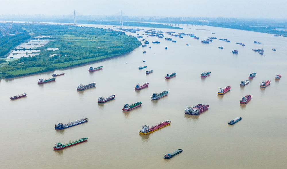 2024年6月1日,船舶在湖北武漢市陽(yáng)邏港區(qū)水域行駛(無(wú)人機(jī)照片)。新華社記者 杜子璇 攝
