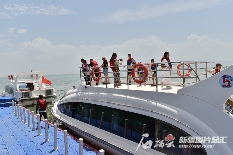 △6月15日,游客在博斯騰湖景區(qū)乘坐游艇游玩。石榴云/新疆日報記者 王立華攝