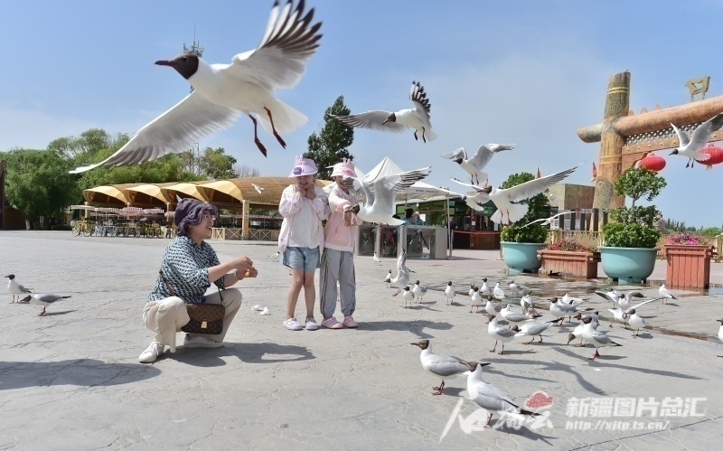 △6月15日,游客在博斯騰湖景區(qū)與海鷗互動。石榴云/新疆日報記者 王立華攝