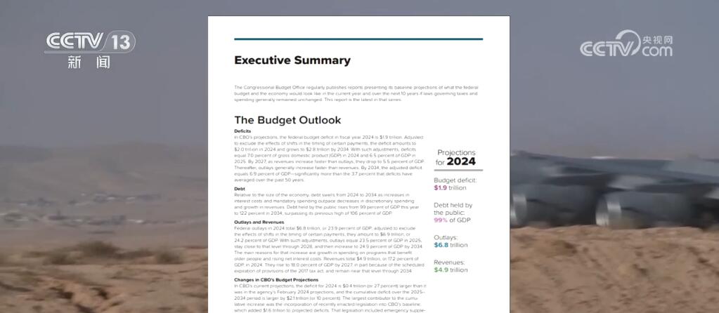 美國(guó)國(guó)會(huì)預(yù)算辦公室18日發(fā)布報(bào)告稱,在2024財(cái)年,聯(lián)邦政府預(yù)算赤字預(yù)計(jì)將達(dá)到1.9萬億美元。