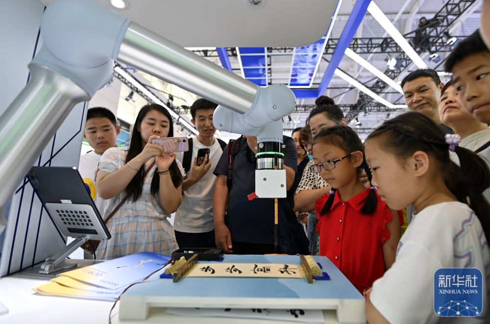 6月22日,觀眾在博覽會上觀看機(jī)器人寫字。新華社記者 李然 攝