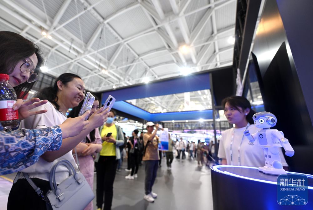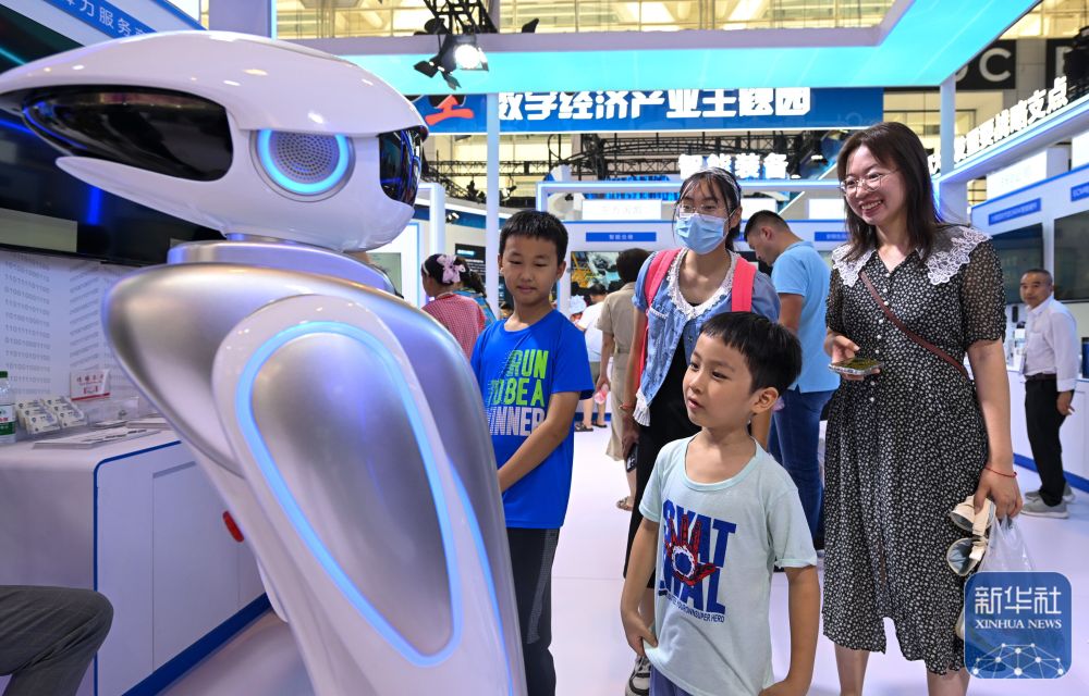 6月21日,參觀者在博覽會上和一款機(jī)器人互動。