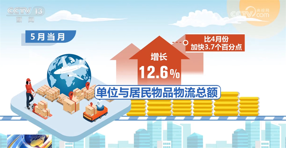 另外,民生消費領(lǐng)域物流需求增速有所加快。1—5月份,單位與居民物品物流總額同比增長11.4%,增速比1—4月份提高0.4個百分點。特別是5月份以來,在假期效應(yīng)、電商促銷以及消費品以舊換新政策等因素帶動下,與民生消費相關(guān)的物流需求回升明顯,5月當(dāng)月單位與居民物品物流總額增長12.6%,比4月份加快3.7個百分點。