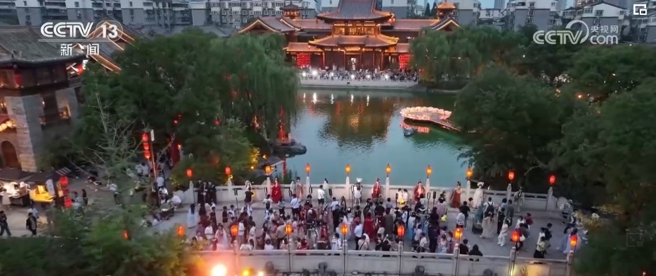 著華服、綰青絲、點(diǎn)朱丹……夜幕降臨,新潭遺址之上建起的洛邑古城內(nèi)人頭攢動(dòng)。精心妝造過的古裝佳人或倚窗凝思,或憑欄望月,置身其中,仿佛穿越時(shí)空,美不勝收。