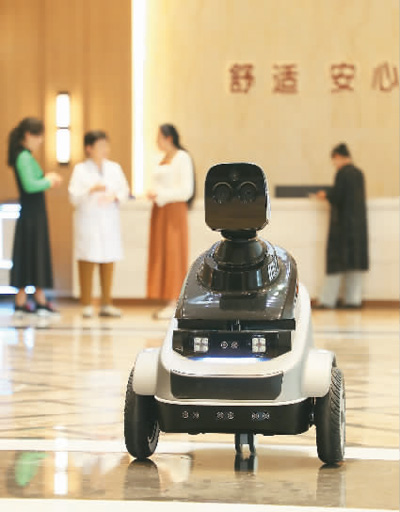 圖為在山東省東營(yíng)市東營(yíng)區(qū)德康寧醫(yī)養(yǎng)中心,智能機(jī)器人在巡檢。