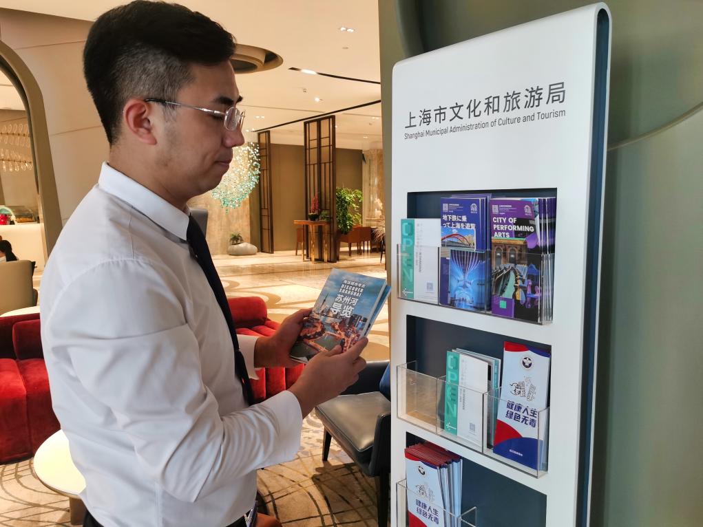 7月7日,李偉在酒店公共區(qū)域補(bǔ)充一批公益地圖、城市旅游導(dǎo)覽手冊(cè),這些資料深受入境游客歡迎。新華社記者 陳愛(ài)平 攝