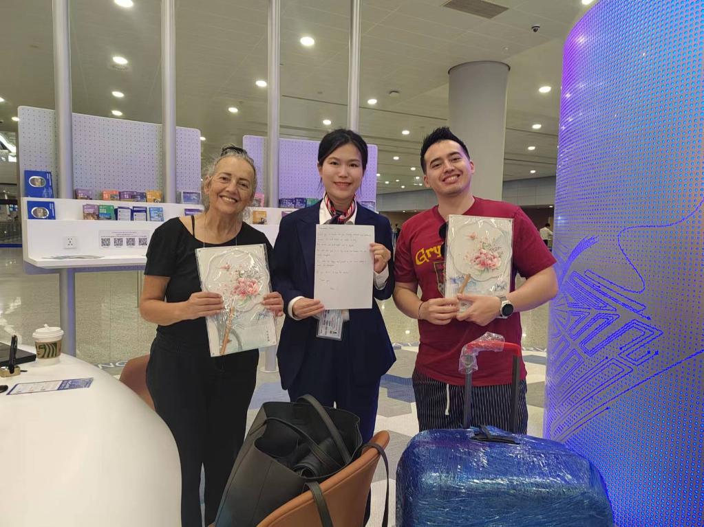 上海浦東機(jī)場(chǎng)T2航站樓的外籍人員一站式綜合服務(wù)中心近日建成投用,按照支付、文旅、通信、交通四個(gè)模塊功能,為外籍人員提供便利化服務(wù)。南非游客艾利克斯在此辦理短期通信卡后寫(xiě)下留言:“中國(guó)讓入境游客體驗(yàn)到更多便利,這讓我們非常開(kāi)心。上海電信的工作人員還送上兩把中國(guó)扇子用以緩解暑熱?!?/p>