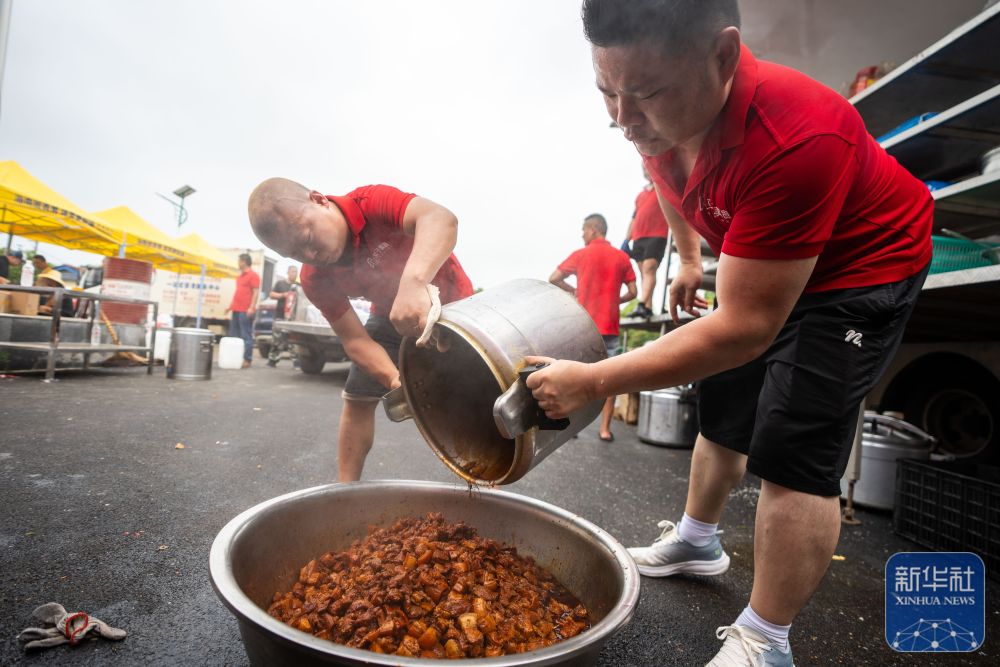 7月8日,在岳陽市良心堡鎮(zhèn)望君洲村,志愿者在炒制菜肴。新華社記者 陳思汗 攝