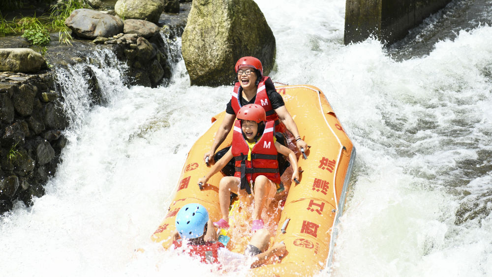7月14日,游客在湖南省常寧市塔山瑤族鄉(xiāng)西江漂流景區(qū)漂流。新華社發(fā)(周秀魚春攝)