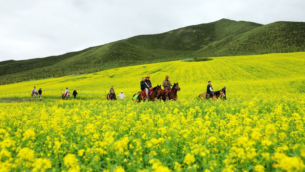 7月13日,游客騎馬游覽甘肅省張掖市民樂(lè)縣扁都口生態(tài)景區(qū)油菜花海。新華社發(fā)(成林?jǐn)z)