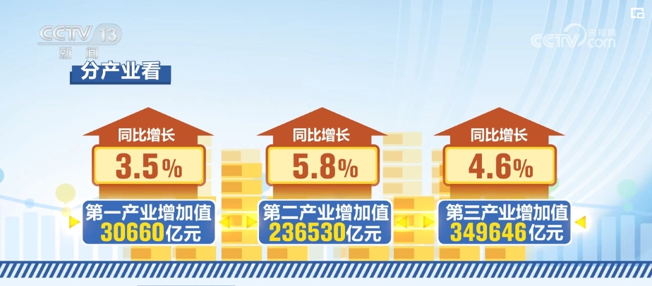 分產(chǎn)業(yè)看,第一產(chǎn)業(yè)增加值30660億元,同比增長(zhǎng)3.5%;第二產(chǎn)業(yè)增加值236530億元,增長(zhǎng)5.8%;第三產(chǎn)業(yè)增加值349646億元,增長(zhǎng)4.6%。分季度看,一季度國內(nèi)生產(chǎn)總值同比增長(zhǎng)5.3%,二季度增長(zhǎng)4.7%。從環(huán)比看,二季度國內(nèi)生產(chǎn)總值增長(zhǎng)0.7%。