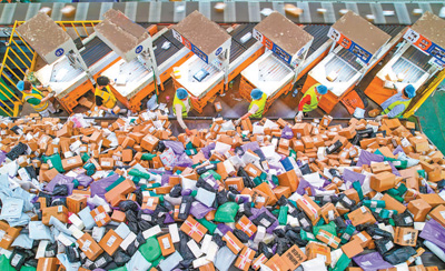 圖為江蘇省宿遷經(jīng)濟(jì)技術(shù)開發(fā)區(qū)郵政郵件處理中心,工作人員在進(jìn)行分揀。