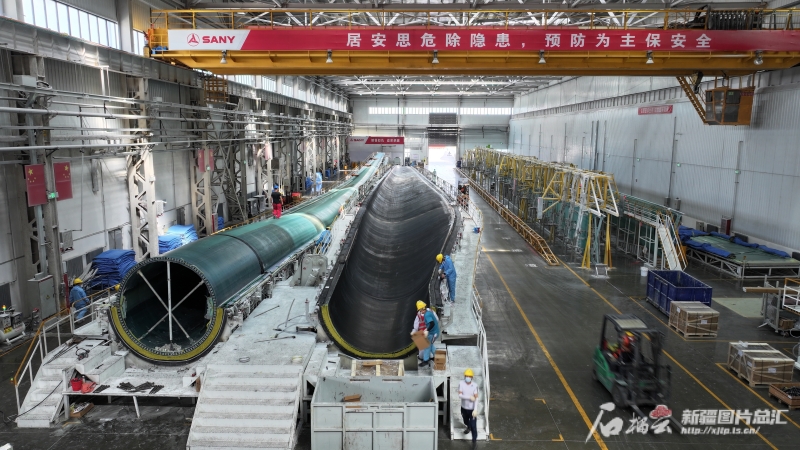7月12日,在新疆塔城重點(diǎn)開(kāi)發(fā)開(kāi)放試驗(yàn)區(qū)先行發(fā)展區(qū),三一(塔城)風(fēng)電設(shè)備有限公司葉片生產(chǎn)現(xiàn)場(chǎng)。代姣美攝