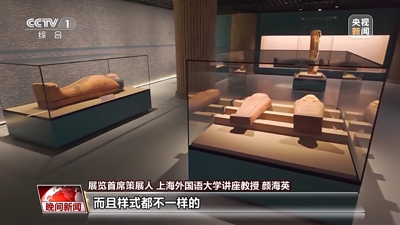 展覽首席策展人、上海外國(guó)語(yǔ)大學(xué)講座教授 顏海英:選了10個(gè)最精美的,而且樣式都不一樣的彩繪人形棺,其中最大的一個(gè)特點(diǎn)就是它的臉涂成不同的顏色,現(xiàn)在展廳里面立著一個(gè)綠臉的棺,然后還有紅臉的、黑臉的,那它具體是什么不同的象征含義,現(xiàn)在我們還沒有解讀,這是未來(lái)將要研究的問(wèn)題。