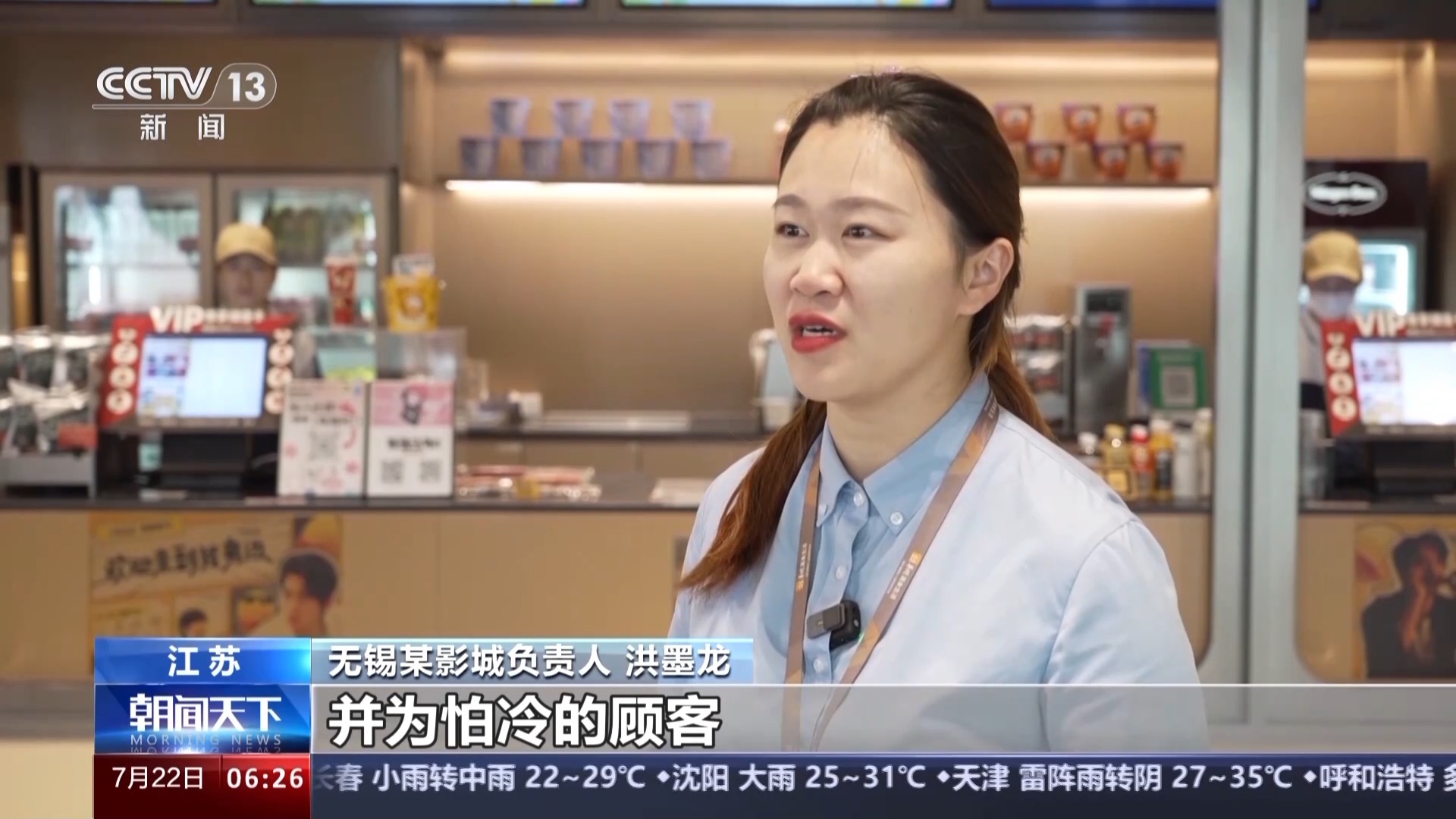 無錫某影城負(fù)責(zé)人 洪墨龍:首先我們保證影廳的溫度適宜,并為怕冷的顧客提供免費(fèi)干凈的毛毯。我們還會(huì)通過現(xiàn)場(chǎng)的陳列布置,打造主題觀影氛圍,讓觀眾在觀影過程中有更多的參與感和互動(dòng)體驗(yàn)。