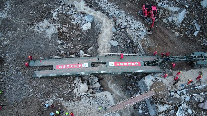 原本的石橋損壞后,救援隊伍用木板搭了一座臨時橋。7月21日晚上8點15分,就在受損的豆腐石橋位置,中國安能三局成功架設起一座應急機械化橋,解決了救援人員和重型機械通行問題,為后續(xù)人員搜救和應急保障提供了有力支撐。接下來,更多的大型機械將開進救援現(xiàn)場,搜救失聯(lián)人員、排危除險、消殺等工作仍在繼續(xù)。
