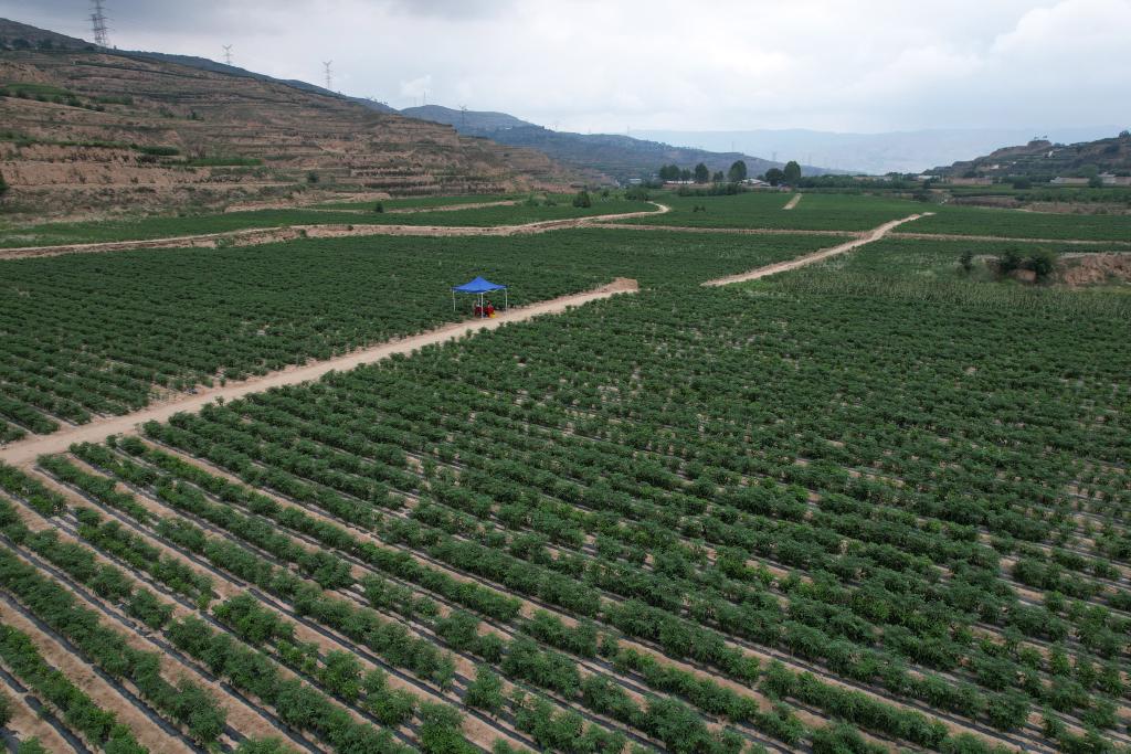 這是在天水市甘谷縣新興鎮(zhèn)侯家溝村拍攝的辣椒生產(chǎn)基地(無人機照片)。新華社記者 范培珅 攝