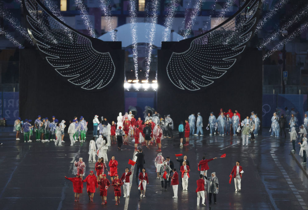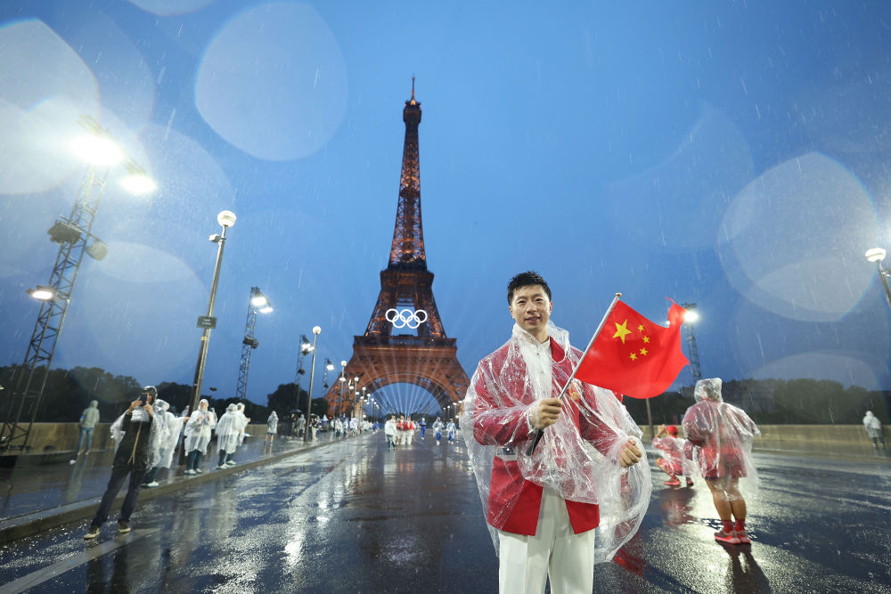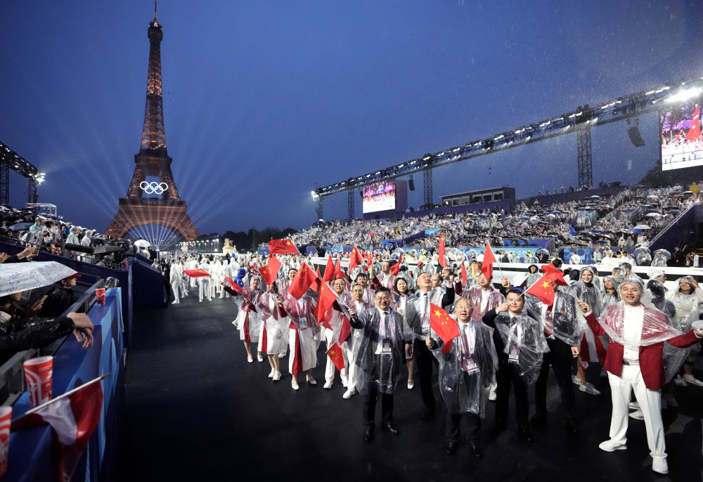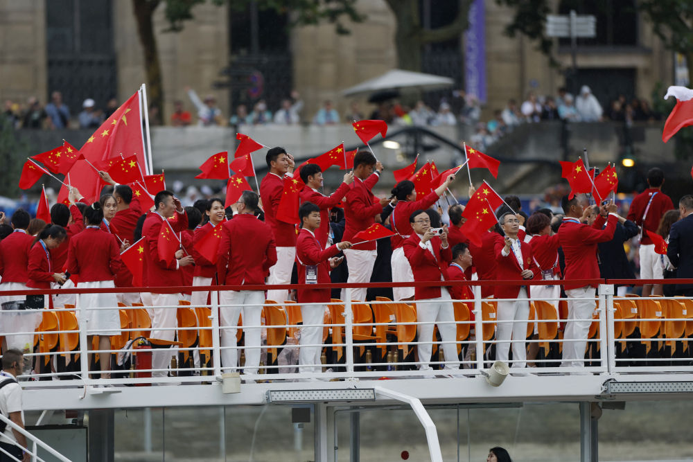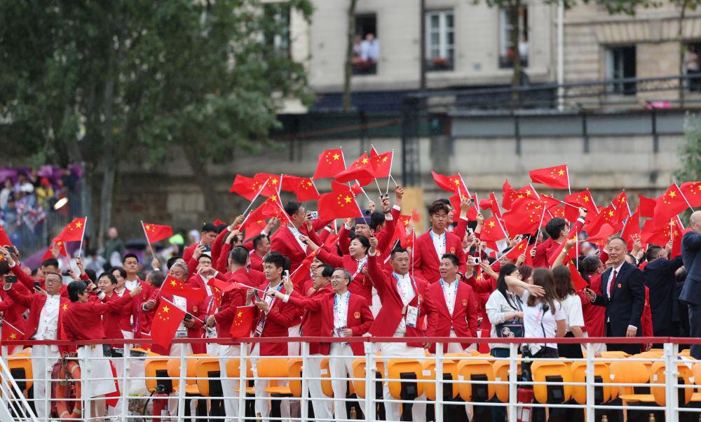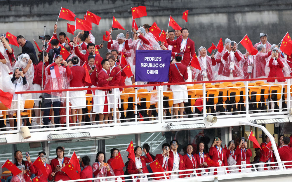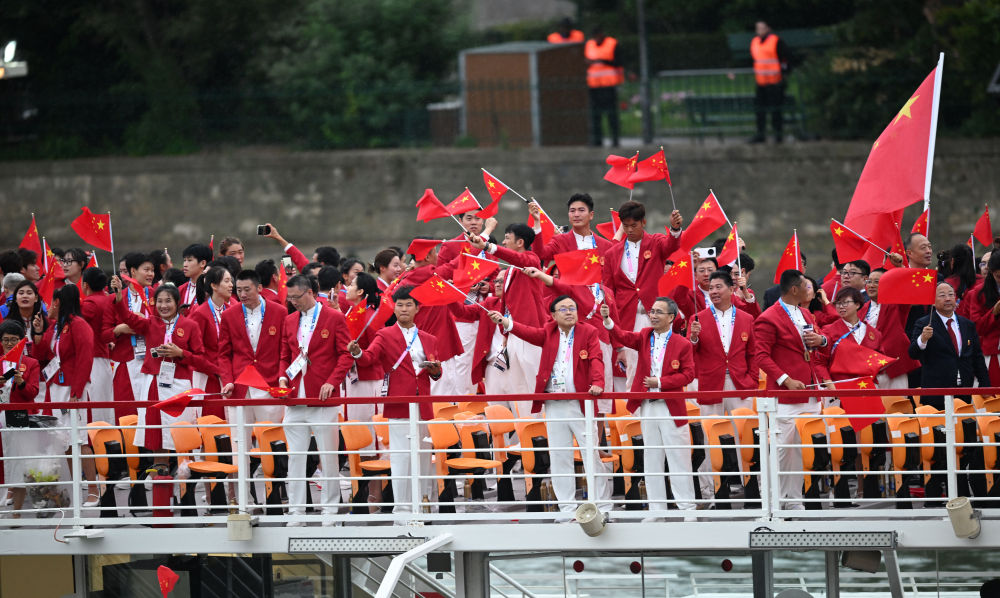 當(dāng)?shù)貢r(shí)間7月26日,第33屆夏季奧林匹克運(yùn)動(dòng)會(huì)開(kāi)幕式在法國(guó)巴黎舉行。乒乓球運(yùn)動(dòng)員馬龍、花樣游泳運(yùn)動(dòng)員馮雨高擎五星紅旗,中國(guó)體育代表團(tuán)運(yùn)動(dòng)員乘船在塞納河巡游。
