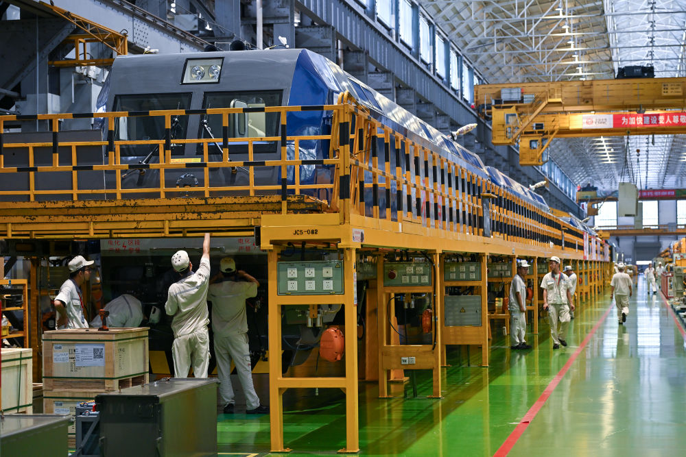 7月26日,中車株機公司工作人員在總成車間組裝大功率電力機車。新華社記者 李鑫 攝