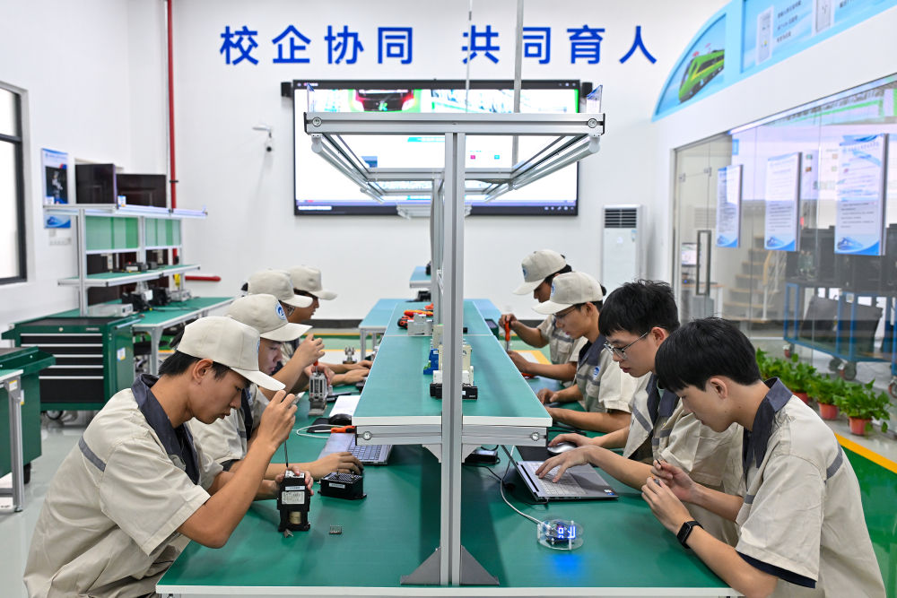 7月26日,湖南鐵道職業(yè)技術學院的學生在車載電源系統(tǒng)運維實訓室進行核心零部件的拆裝與檢測訓練。該實訓室可開展軌道車輛逆變裝置運行、維護、試驗、檢修等實習實訓,電源變換技術、電力電子技術等課程實習實訓。新華社記者 李鑫 攝