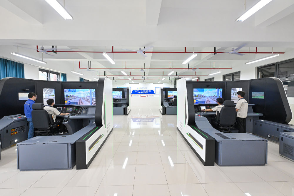 7月26日,湖南鐵道職業(yè)技術學院的學生在產(chǎn)教融合“復興號”動車組智能駕駛實訓室內(nèi)學習動車駕駛。 新華社記者 李鑫 攝