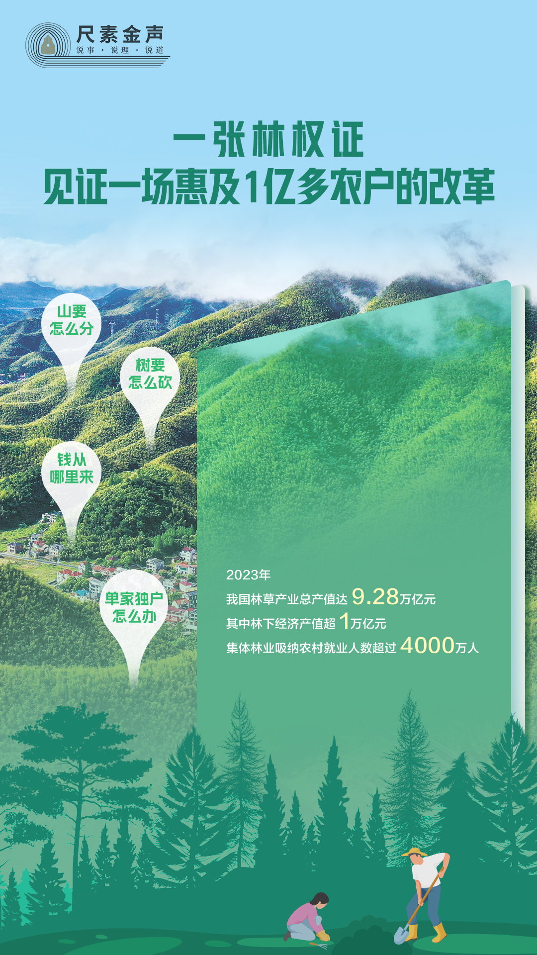 林改,改出了滿目青山,改出了金山銀山,廣大集體林區(qū)發(fā)展添活力,億萬(wàn)林農(nóng)鼓腰包。去年,我國(guó)林草產(chǎn)業(yè)總產(chǎn)值達(dá)9.28萬(wàn)億元,其中林下經(jīng)濟(jì)產(chǎn)值超1萬(wàn)億元,經(jīng)濟(jì)林產(chǎn)量達(dá)2.26億噸,成為繼糧食、蔬菜之后的第三大農(nóng)產(chǎn)品,集體林業(yè)吸納農(nóng)村就業(yè)人數(shù)超過4000萬(wàn)人。