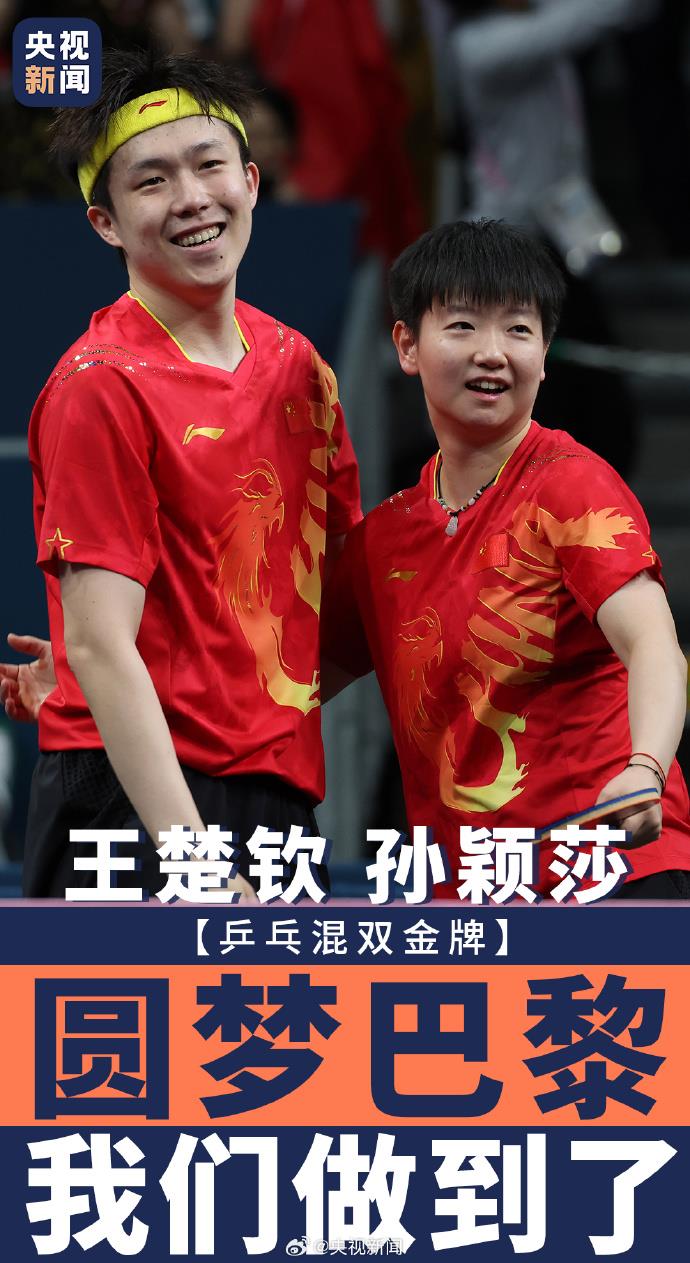 7月30日,在巴黎奧運(yùn)會乒乓球混合雙打決賽中,中國組合王楚欽/孫穎莎4-2戰(zhàn)勝朝鮮組合,奪得金牌。“我們做到了!”東京的遺憾在巴黎畫上了一個圓滿的句號!