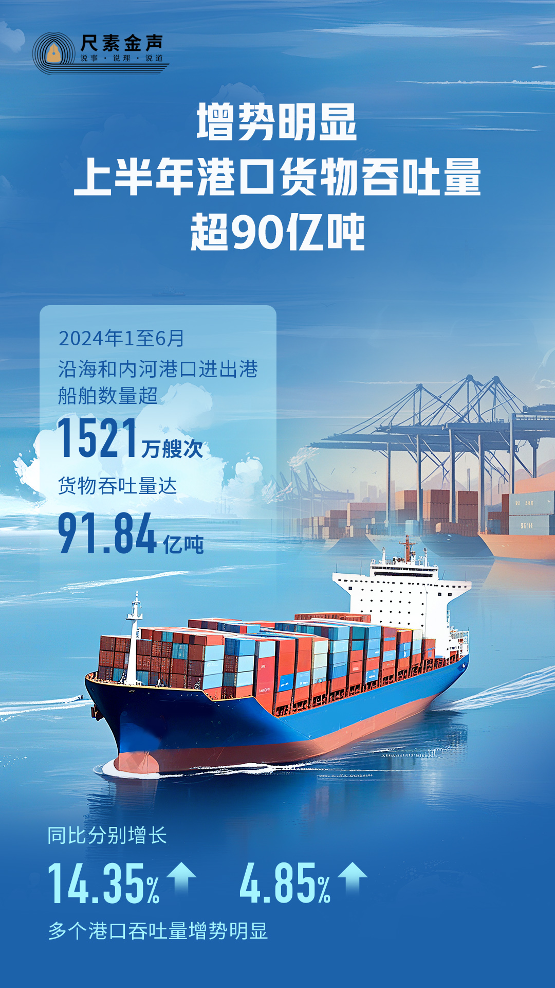 港口,貨物進(jìn)出口的重要門戶;港口貨物吞吐量,國民經(jīng)濟(jì)發(fā)展的“晴雨表”。日前,中國港口運(yùn)行“半年報(bào)”公布:今年1至6月,沿海和內(nèi)河港口進(jìn)出港船舶數(shù)量超1521萬艘次,貨物吞吐量達(dá)91.84億噸,同比分別增長14.35%、4.85%,多個港口吞吐量增勢明顯。