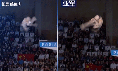 我們把動作放慢,對冠亞軍選手動作作對比,不難發(fā)現,在空中轉體翻騰動作和入水水花上,中國的兩位選手明顯更勝一籌。